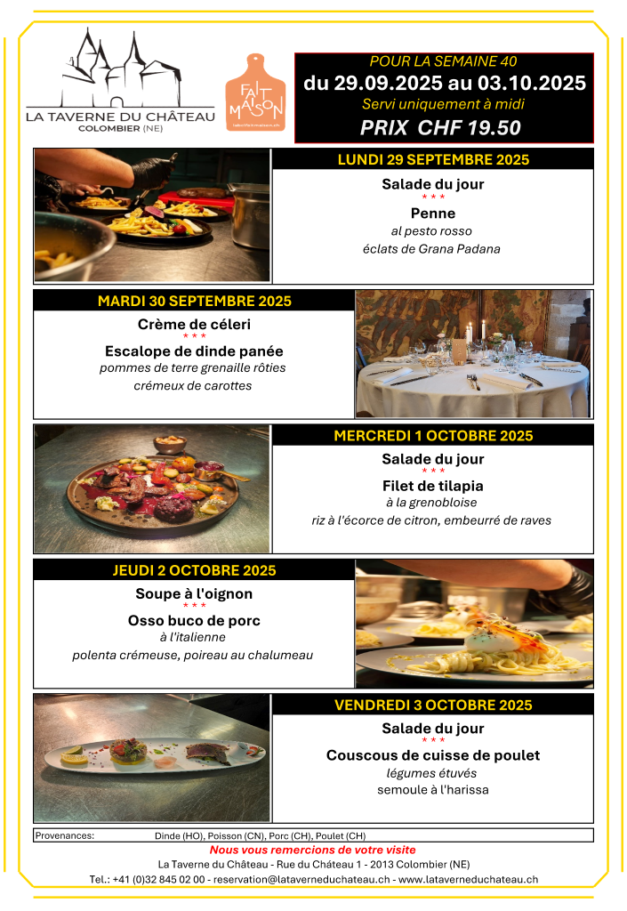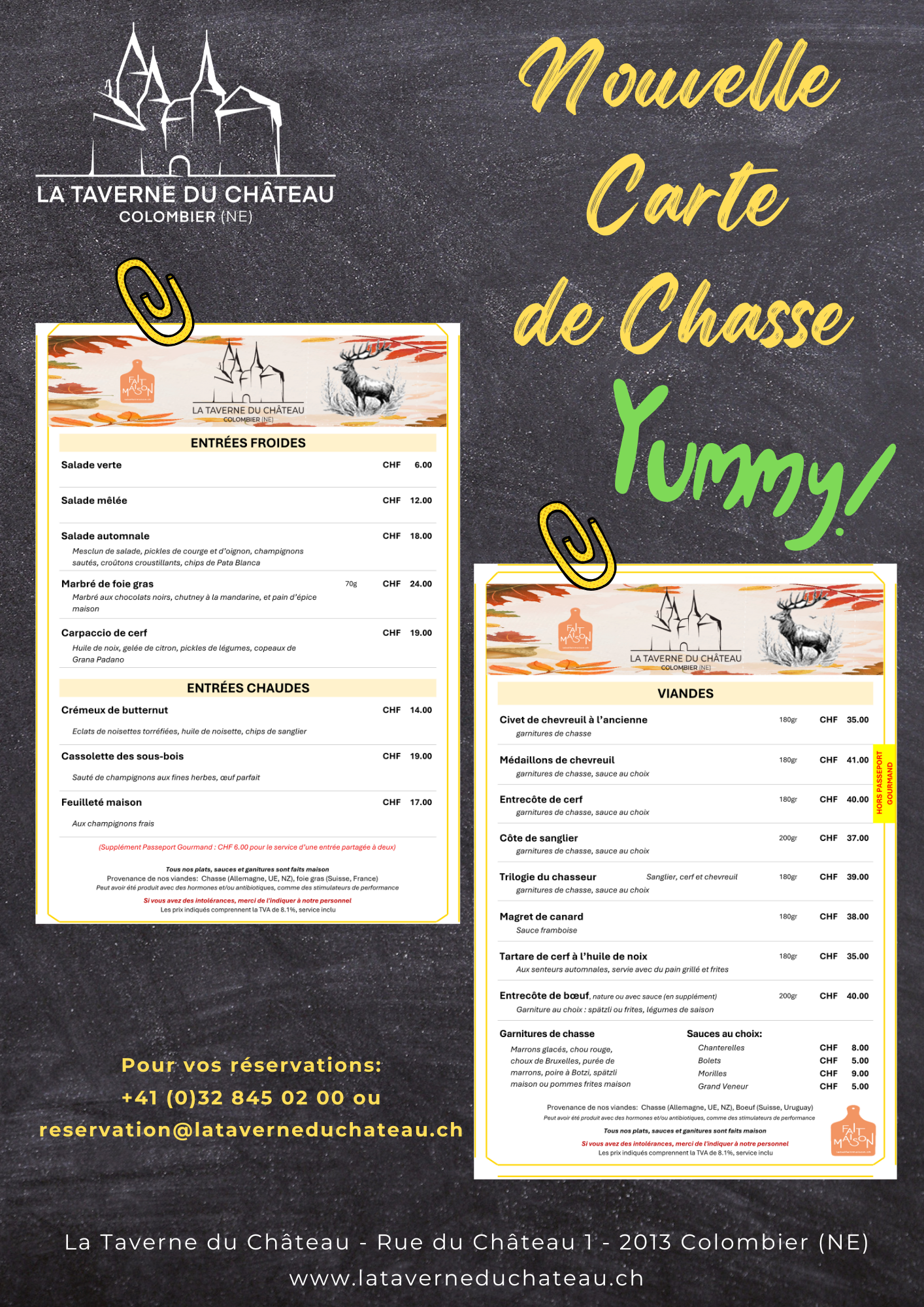 +41 (0)32 845 02 00 ou par mail à: reservation@lataverneduchateau.ch