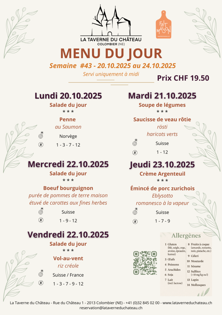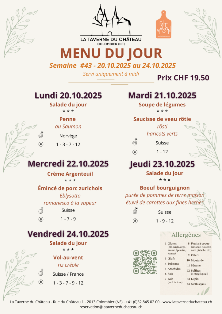 +41 (0)32 845 02 00 ou par mail à: reservation@lataverneduchateau.ch