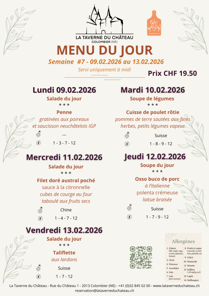 +41 (0)32 845 02 00 ou  par mail à: reservation@lataverneduchateau.ch