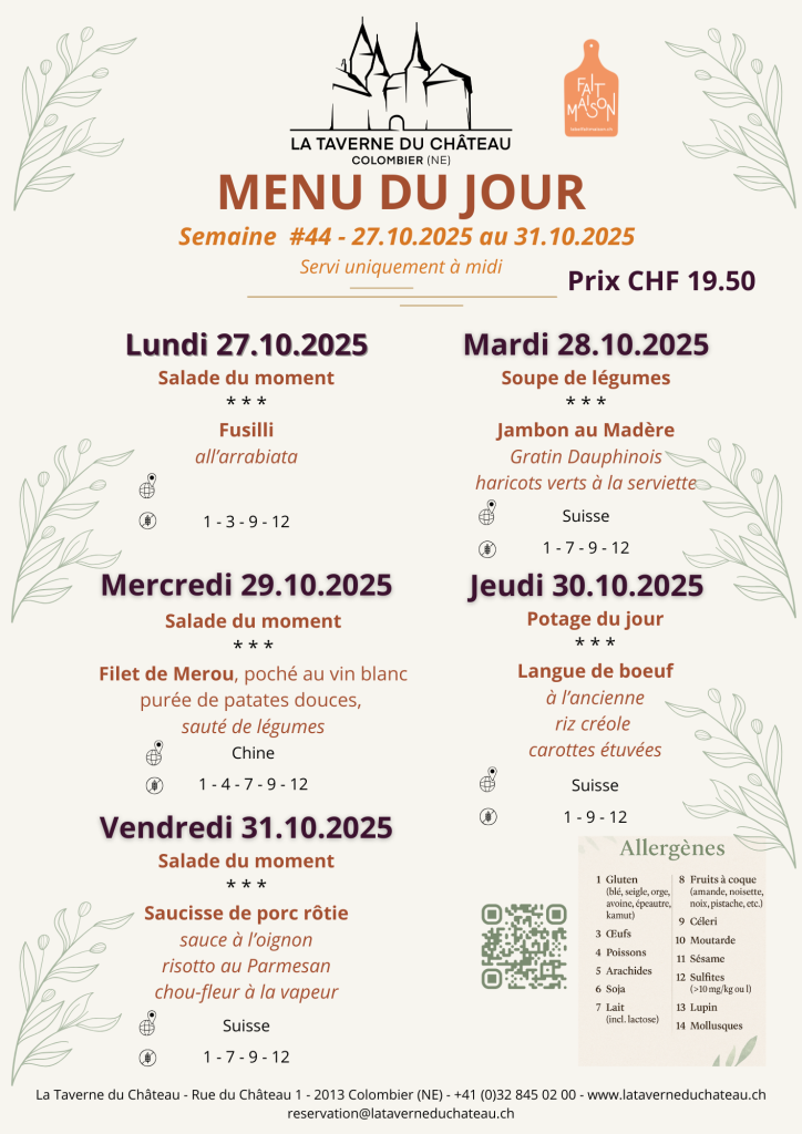 +41 (0)32 845 02 00 ou par mail à: reservation@lataverneduchateau.ch